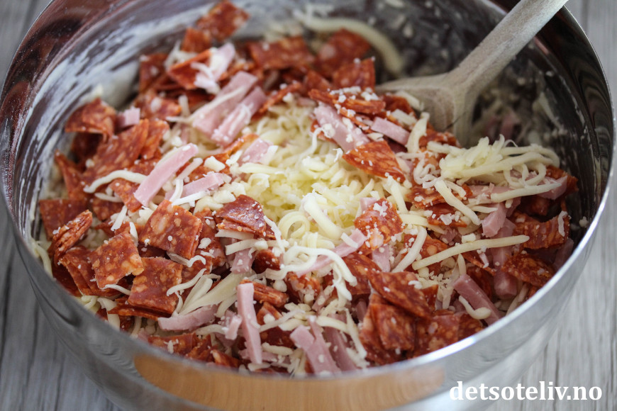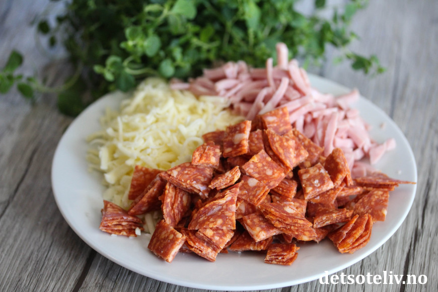 Finn frem det du vil bruke til fyll - jeg bruker her en kombinasjon av skinkestrimler, pepperoni og revet ost.