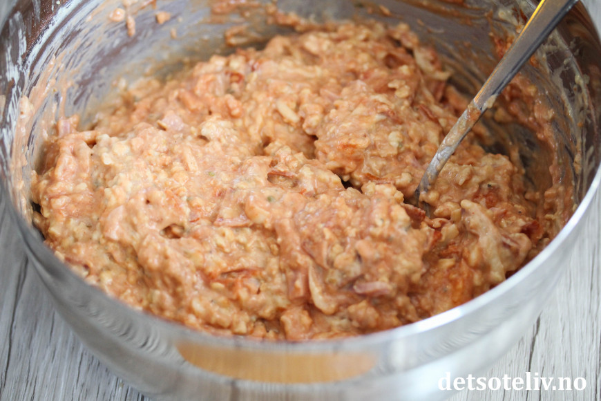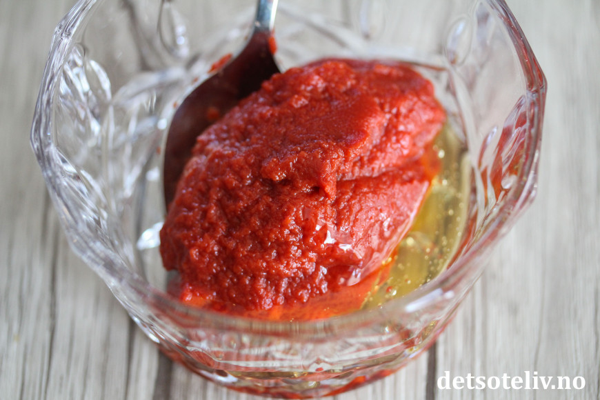 Rør sammen flytende honning og tomatpure. Bland også dette inn i deigen.
