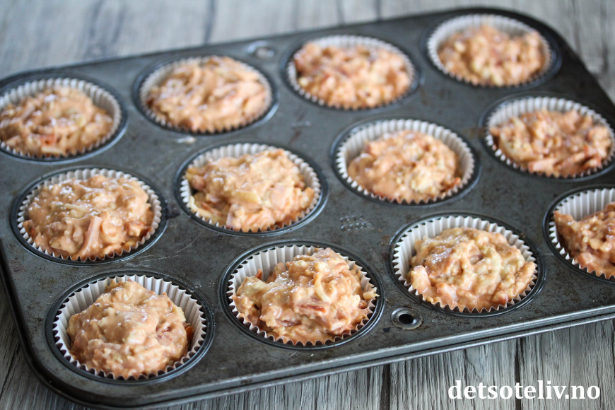 Ha muffinsformer i muffinsbrett. Fordel deigen i formene.