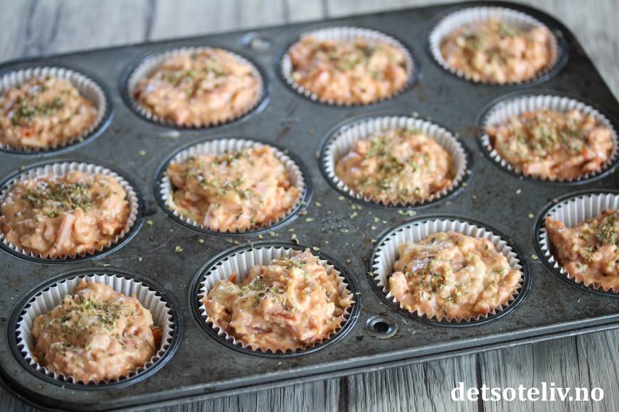 Ha muffinsformer i muffinsbrett. Fordel deigen i formene. Dryss over litt ekstra tørket oregano.