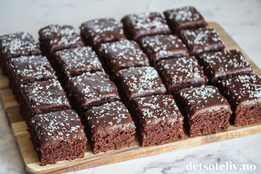 En stor og fristende sjokoladekake med kokosstrø er alltid populært!