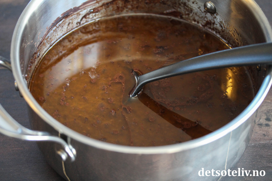 Finn frem en middels stor kjele. Ha kokende vann og kaffepulver i kjelen og rør til kaffepulveret løser seg opp. Ha smør, kokesjokolade oppdelt i biter og kakaopulveret i kjelen. Varm opp på middels varme til smør og sjokolade smelter. Rør blandingen jevn og ta kjelen av platen.