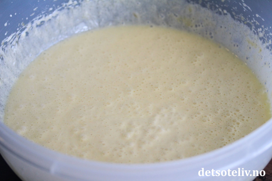 Pisk blandingen til eggedosis. Tilsett seterrømme (eller crème fraîche) og natron og pisk blandingen jevn.
