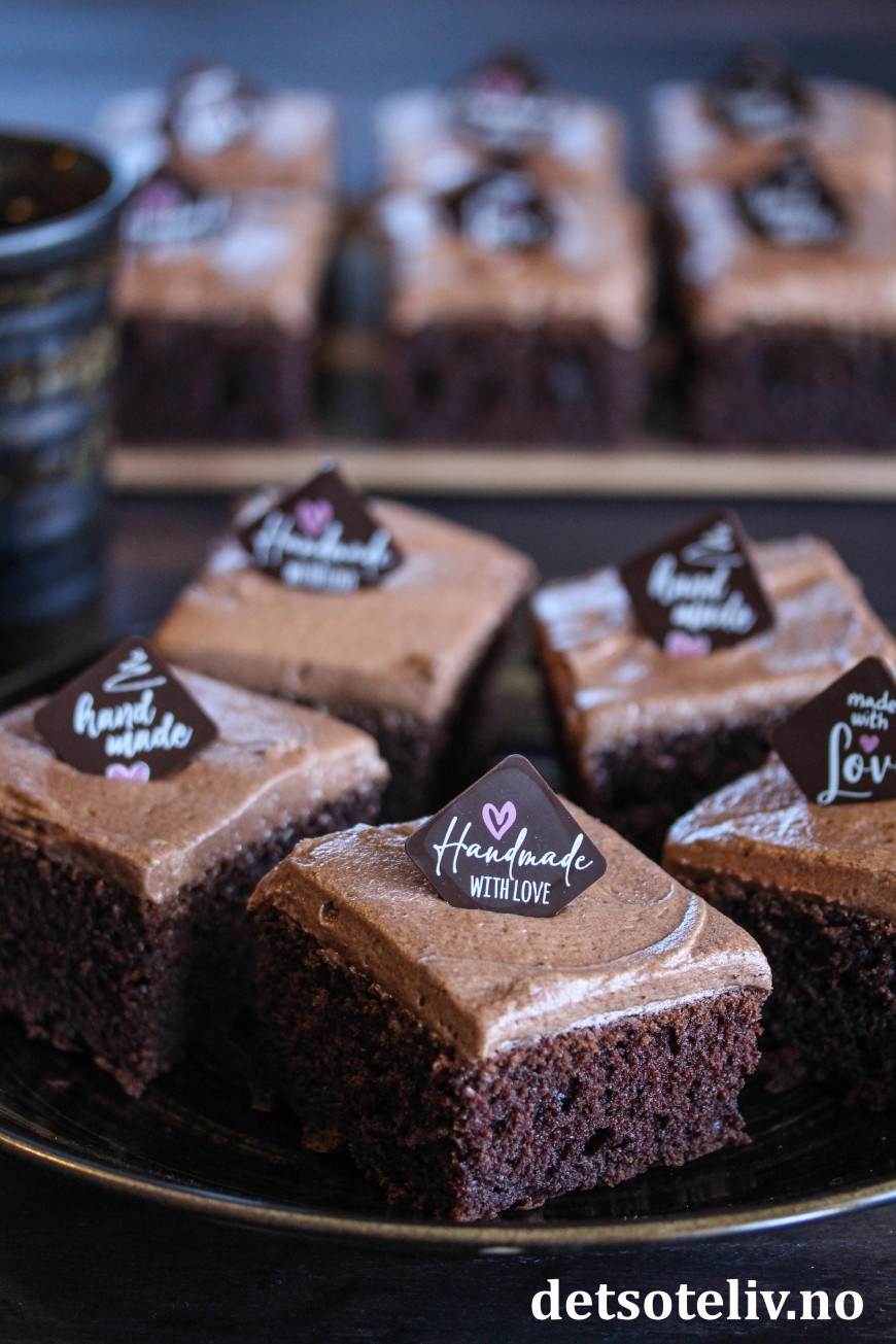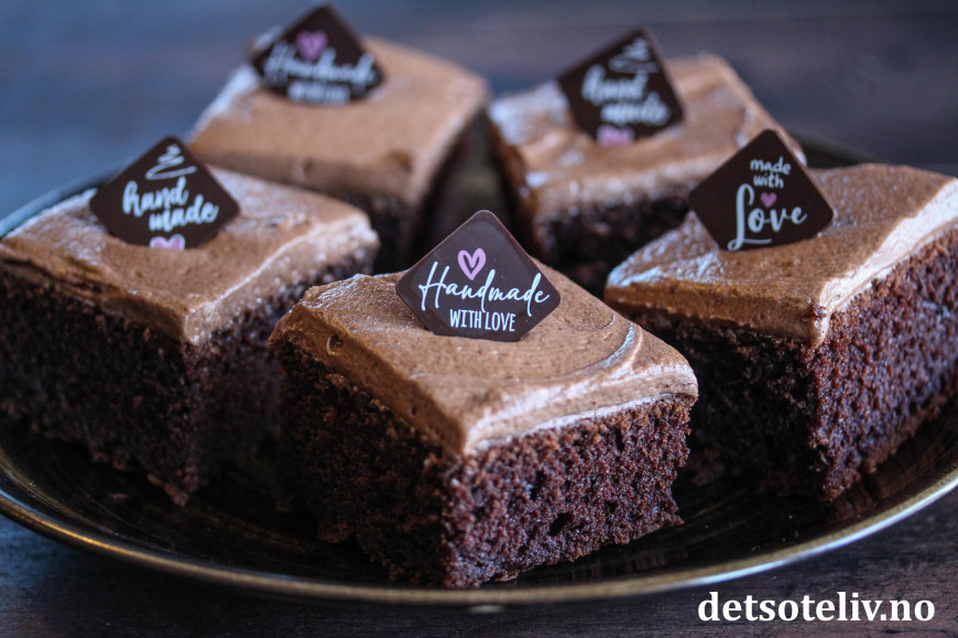 Del kaken i firkanter og pynt kakestykkene med sjokoladepynt etter ønske.
