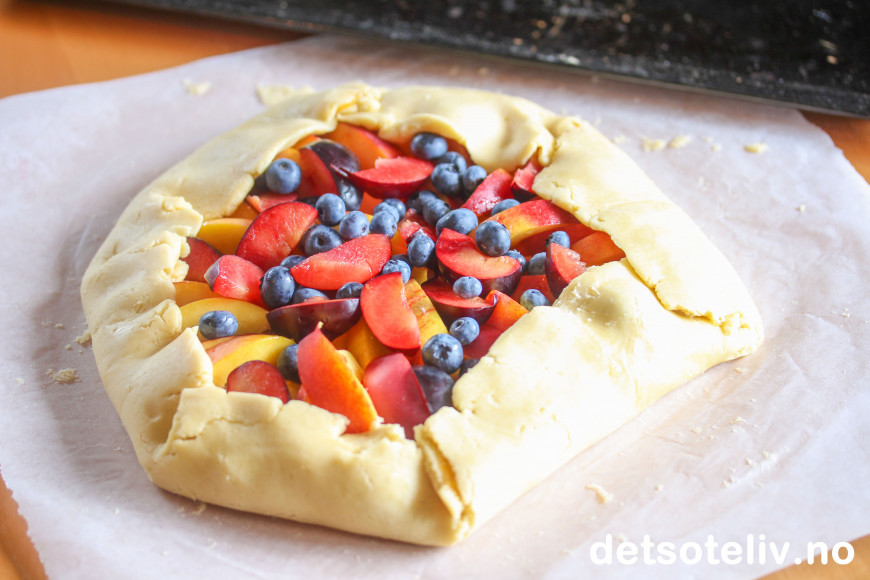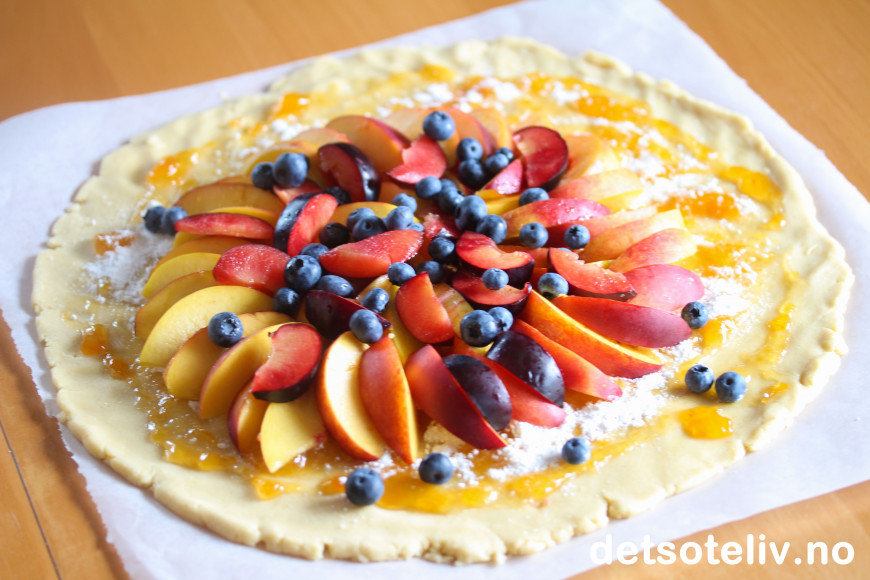 Del opp frukten i skiver og legg på midten av deigen. Jeg la nektarinbåter på først, og deretter skiver av plommer og til slutt blåbærene.
