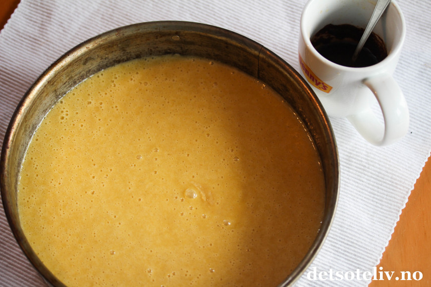 Fordel deigen utover i en rund form (26 cm i diameter) med bakepapir i bunnen.