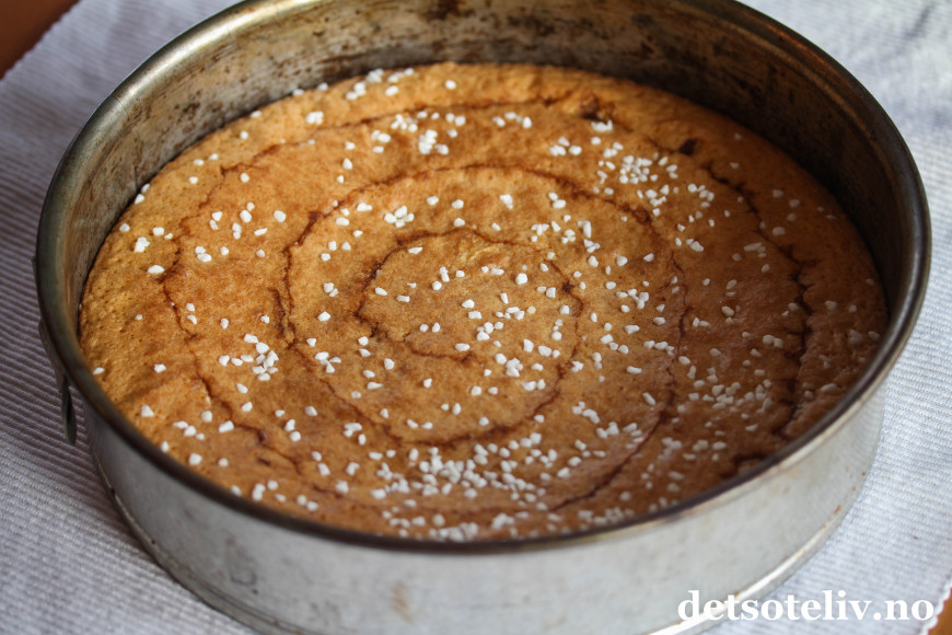 ♥ Merk at jeg bruker en nokså stor, rund form som er 26 cm i diameter. Dette for at kaken skal bli passe flat og ligne mer på en stor kanelbolle. Har du bare 24 cm stor form, blir kaken høyerer og du bør da øke steketiden med ca 10 minutter.