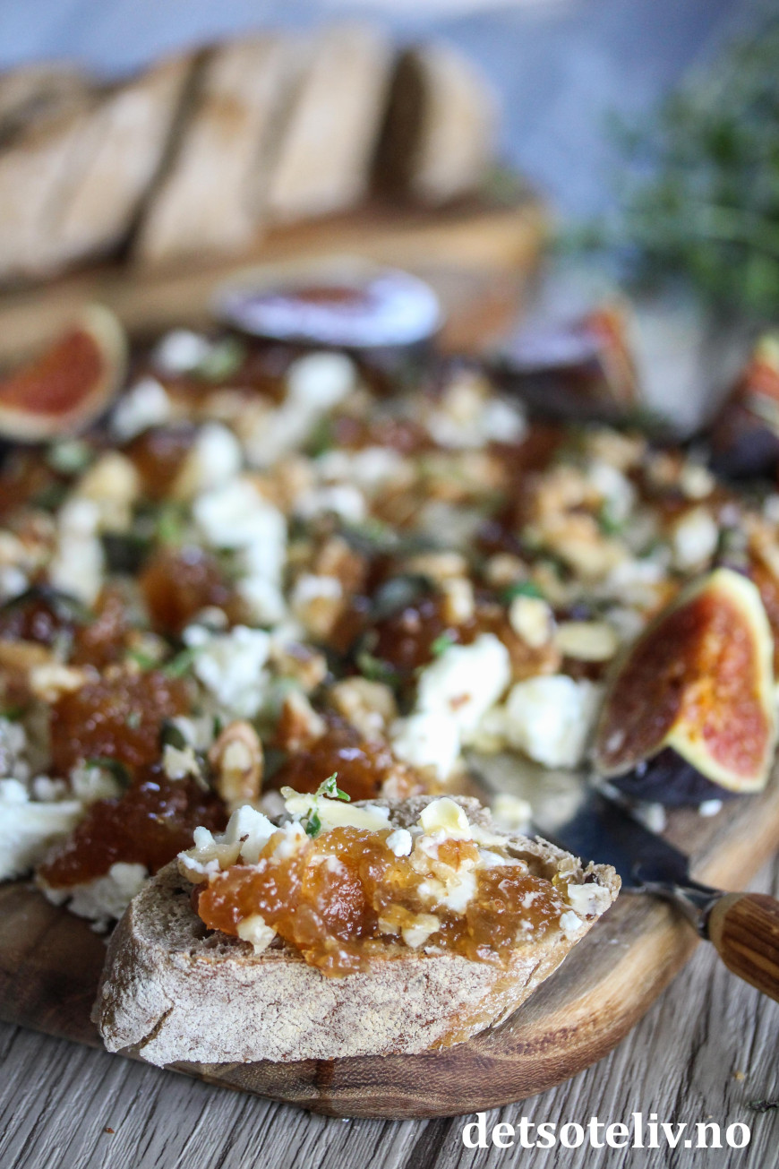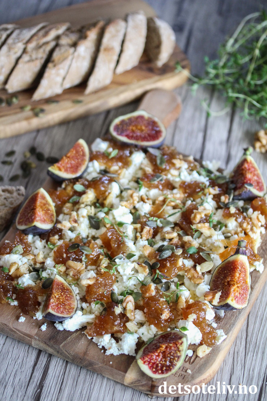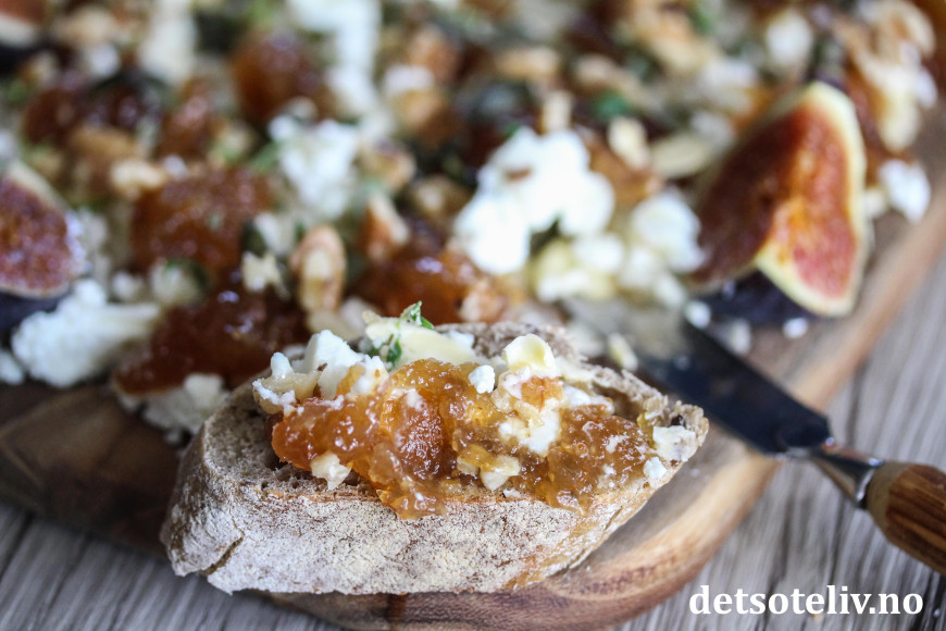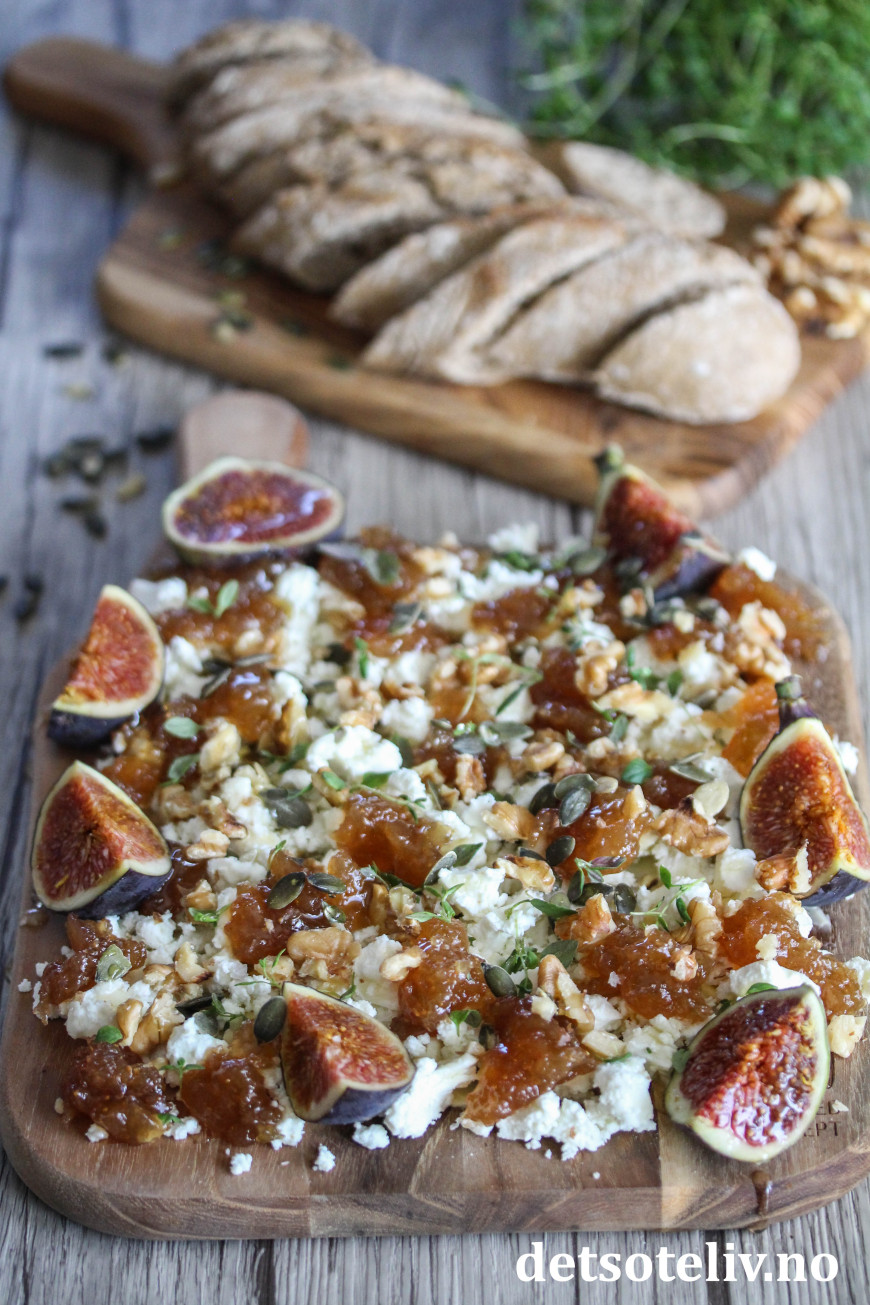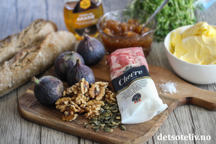 Her har jeg brukt vel så mye chèvre som smør på brettet, som passer bra for de som synes det kan blir for mye rent smør. I tillegg har jeg toppet med fikensyltetøy, ferske fiken, valnøtter, gresskarkjerner, timian, flaksalt og honning.