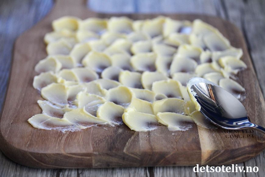 ♥ Du kan dyppe og dra brødet direkte på smørbrettet, men jeg synes det blir mer delikat om man bruker en kniv til å forsyne seg med. Da blir det også lettere å få med seg en passe mengde smør per brød.