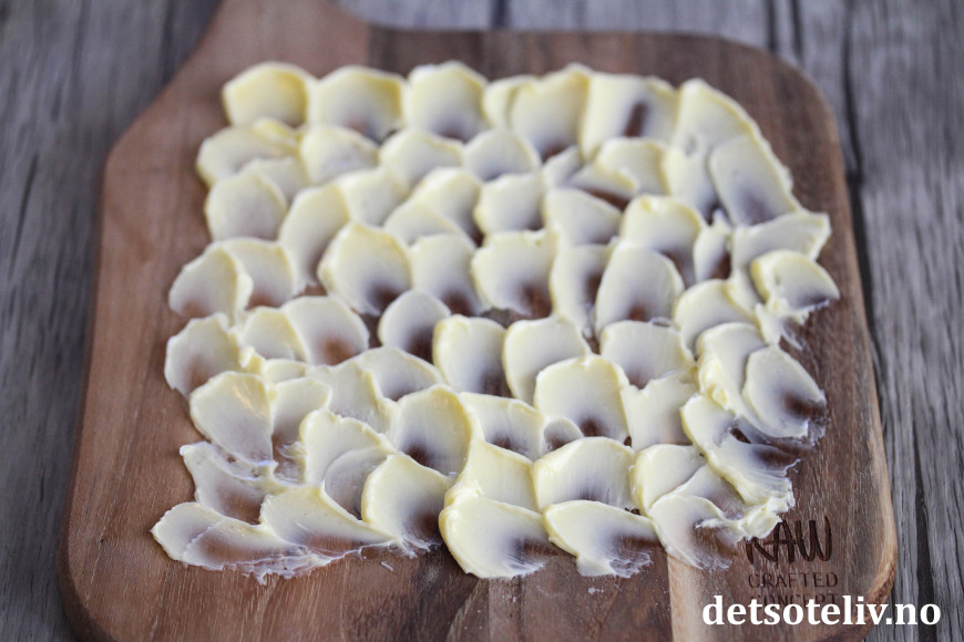 Du kan gjerne fordele smøret litt ujevnt over fjølen, og i klatter, slik at overflaten ikke blir helt glatt.