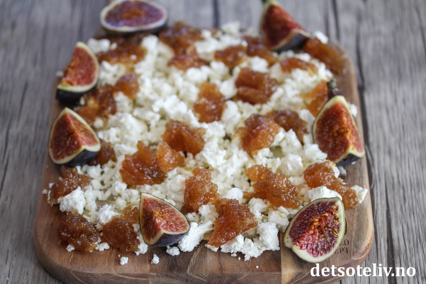 Dander halve, ferske fiken rundt smørbrettet (disse fikenene spises utenom, og kan sløyfes).