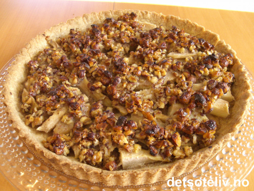 Til nøttelokket smeltes smøret i en kjele sammen med honning. Tilsett revet sitronskall, grovt hakkede nøtter og til slutt melet. Fordel blandingen jevnt over pærene med en spiseskje.