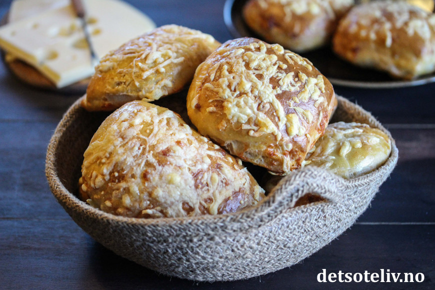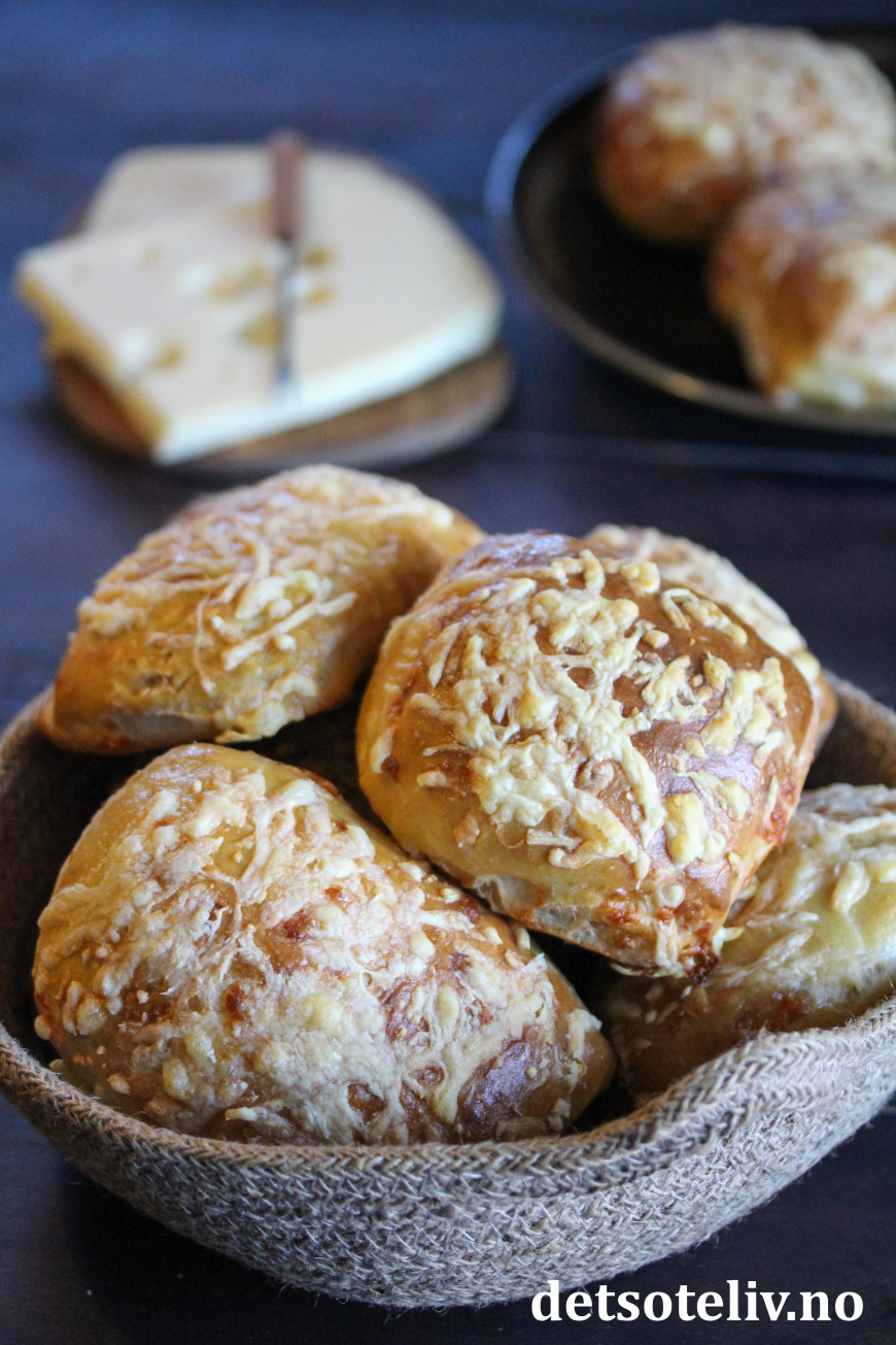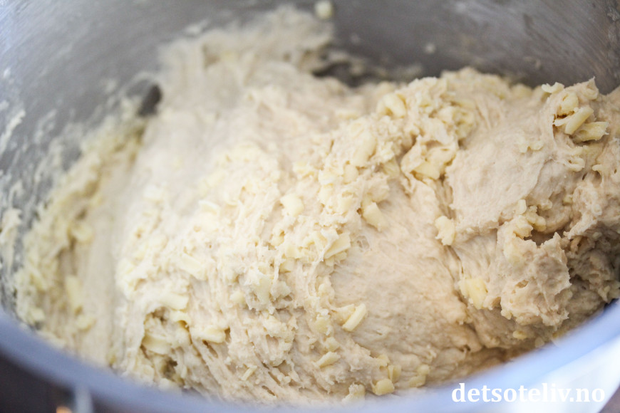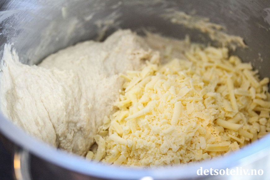 ♥ Elt deigen godt før du tilsetter revet ost. Etter at osten er tilsatt, bør deigen bare knas lett sammen. Dette for at ikke osten skal smelte og gå i oppløsning i deigen.