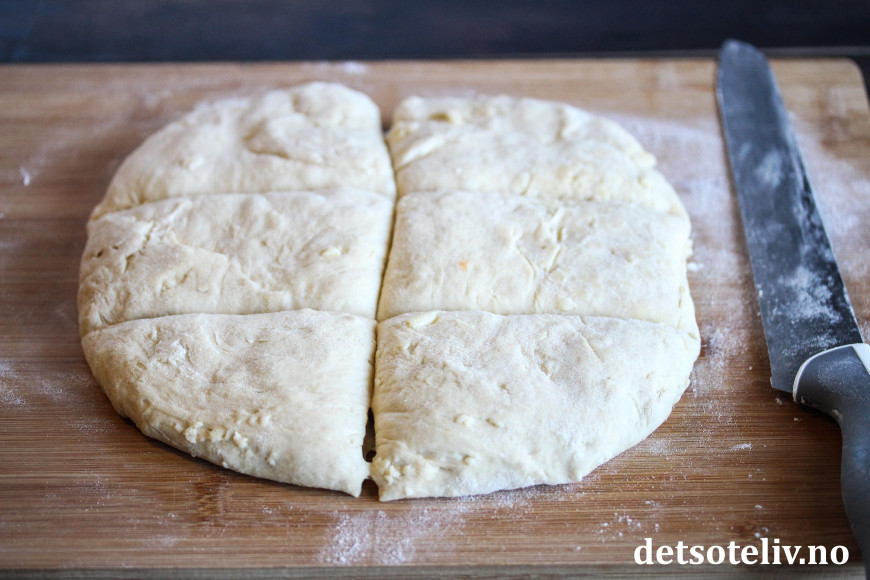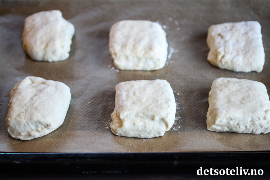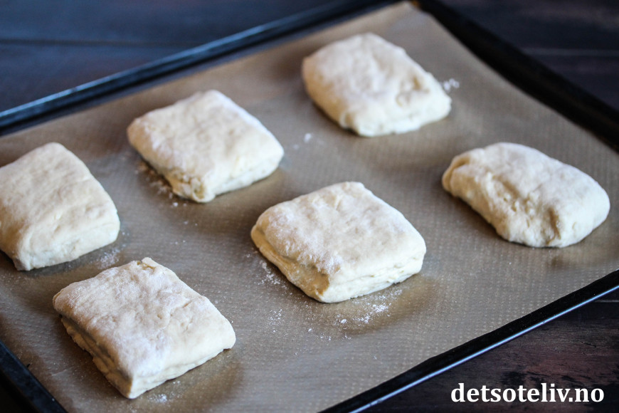 Ha deigen på lett melet bakebord. Del den i to og klapp hver del til en tykk, flat firkant (elt og klem minst mulig for å bevare luftigheten i deigen). Skjær hver firkant i 6 firkantede biter.