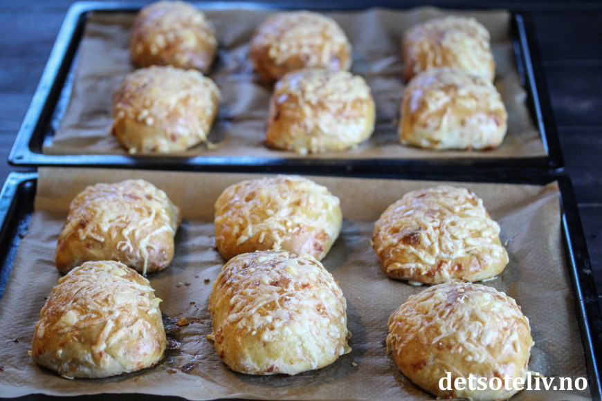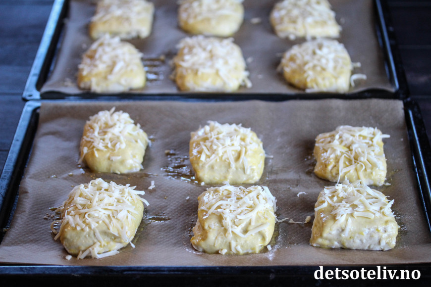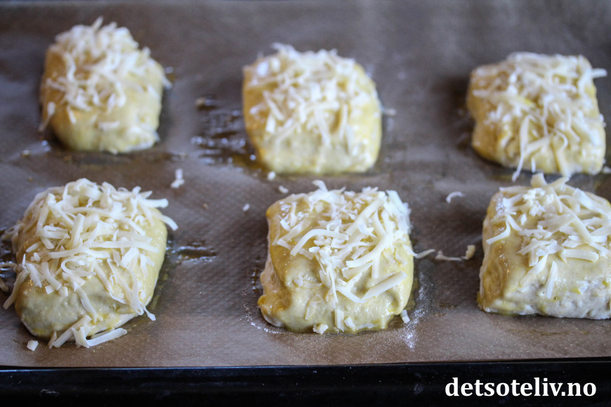 Pensle over rundstykkene med sammenpisket egg og ha på rikelig med revet ost.
