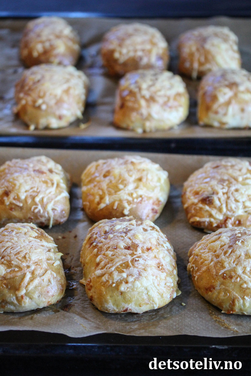 Pensle over rundstykkene med sammenpisket egg og ha på rikelig med revet ost (ja, rikelig! 😋 ).