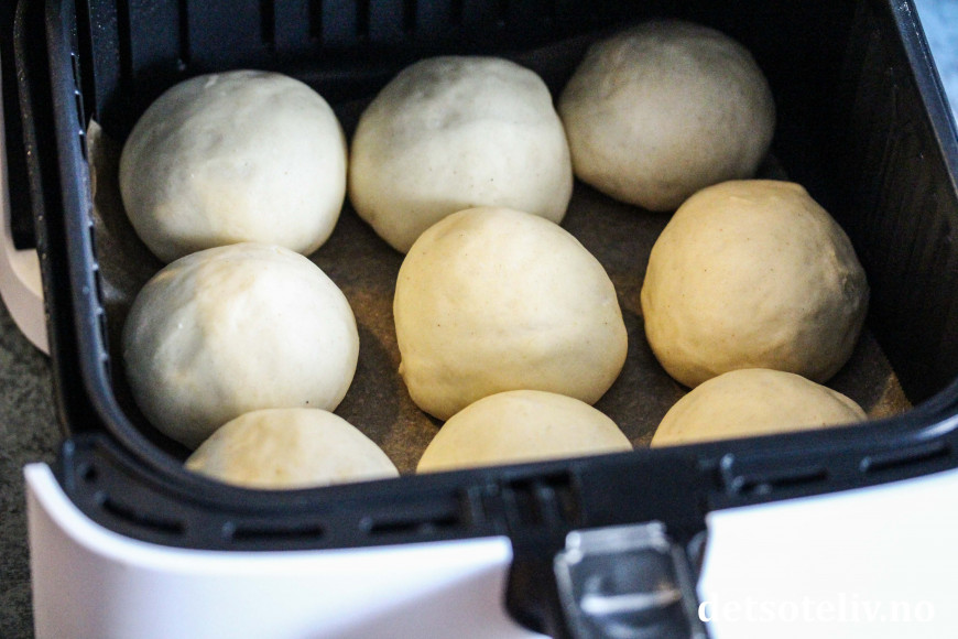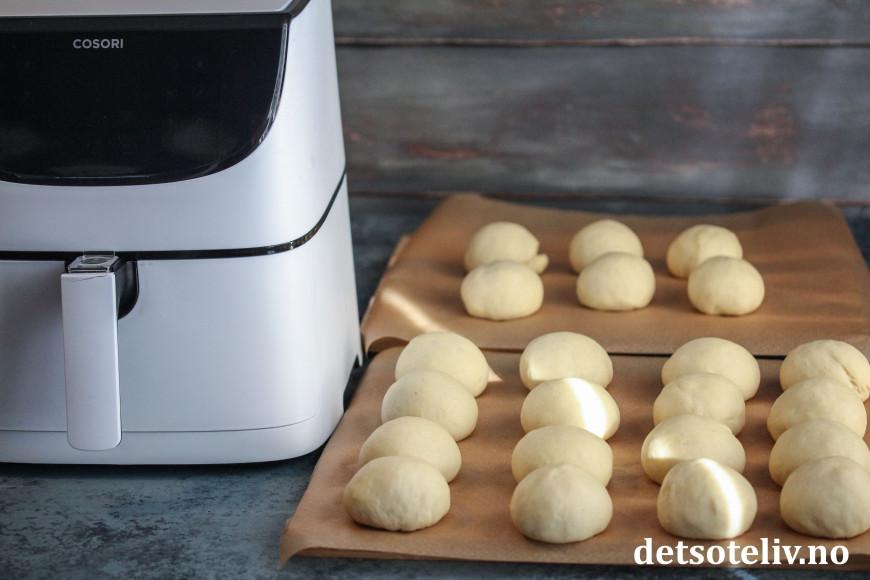 Klipp gjerne til et stykke bakepapir som legges i bunnen av kurven. Sett bollene i kurven på airfryeren (til Cosori airfryer passer det å steke 9 boller av gangen).