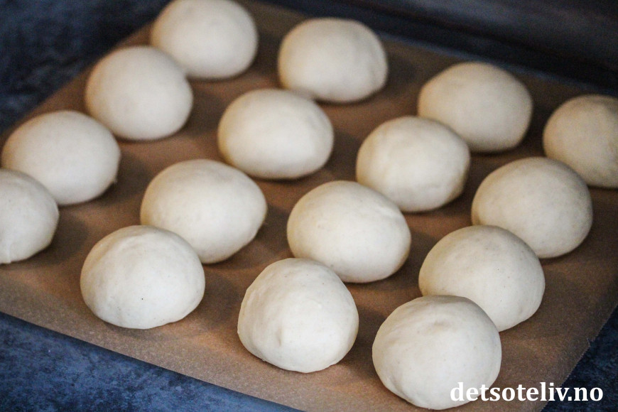 Del deigen i jevnstore emner (ca 70 g deig per emne) og trill dem ut til runde boller.