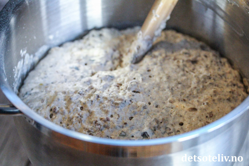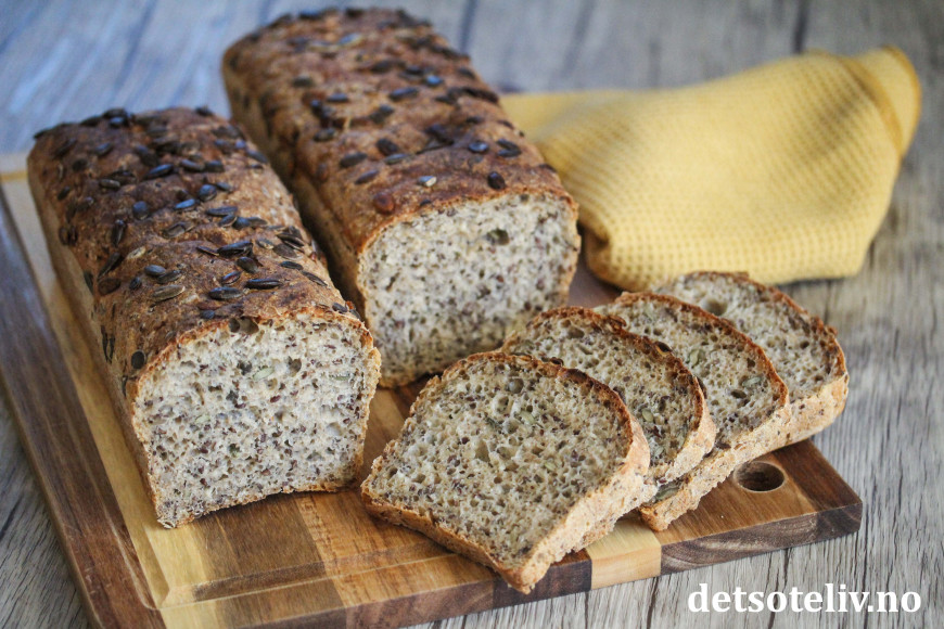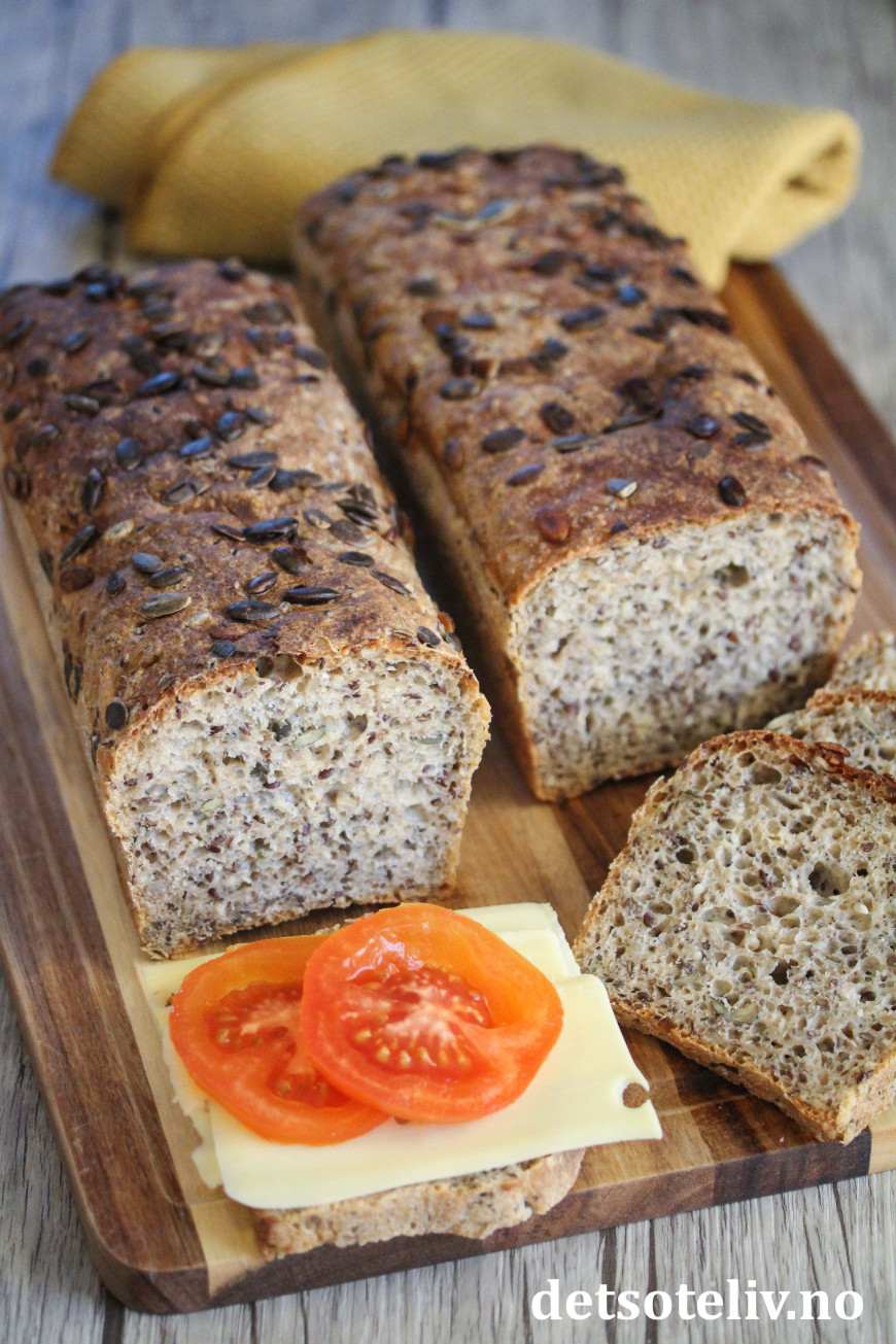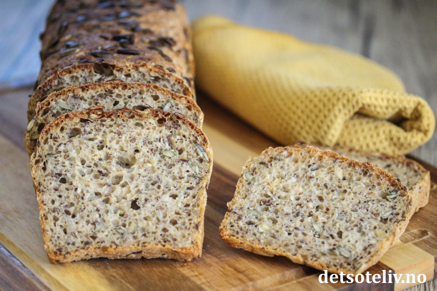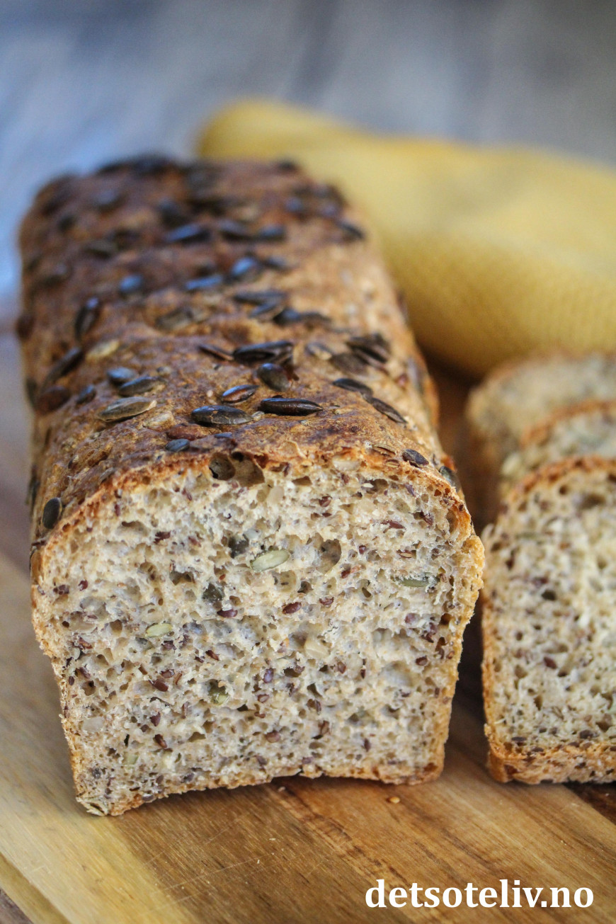 Deigen skal bare røres raskt sammen for hånd og trenger ingen form for elting. Masse kjerner og frø gjør brødet næringsrikt, sunt og veldig smakfullt!