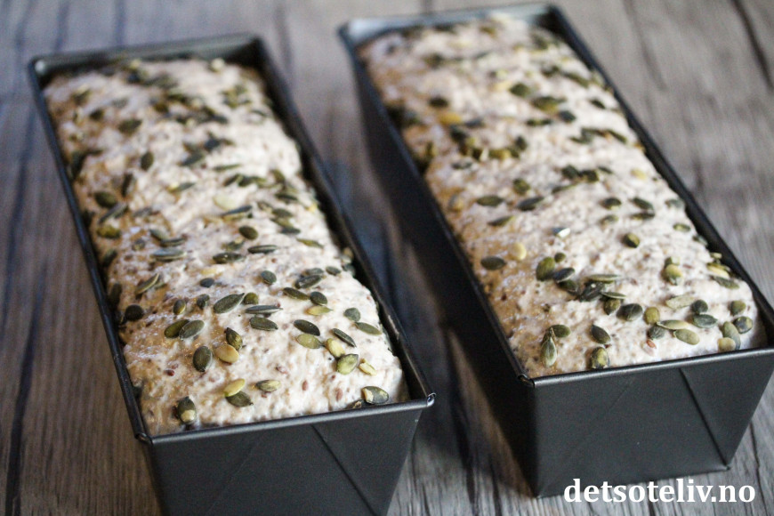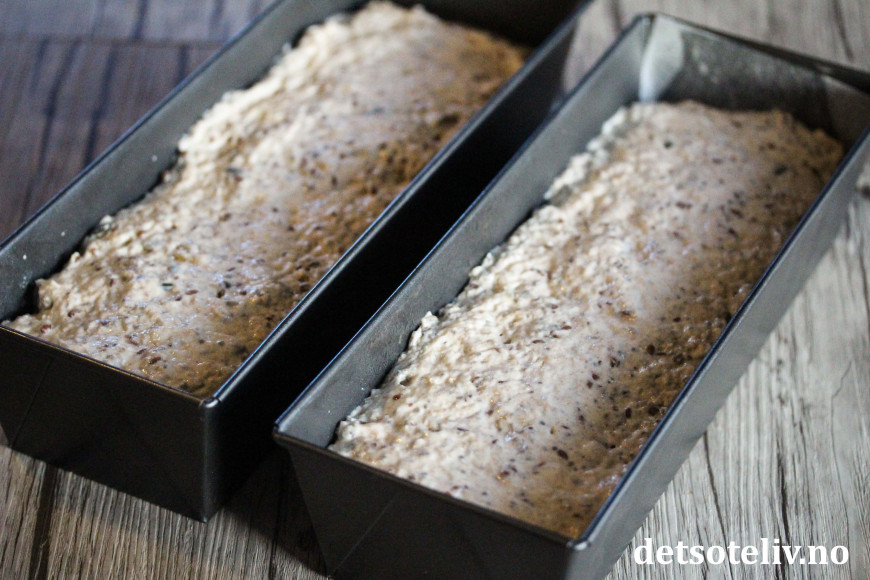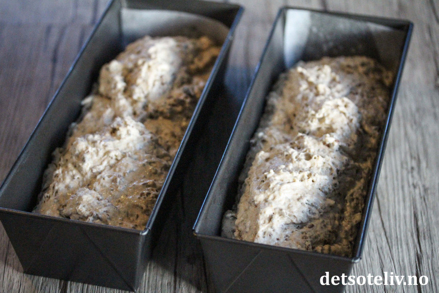Finn frem 2 brødformer (som rommer 1,5 liter hver), spray dem lett med formfett, og legg bakepapir i bunnen av formen. Fordel deigen i formene. Bruk en slikkepott eller en skje fuktet med vann til å jevne ut overflaten av deigen som fortsatt vil være nokså klissete.