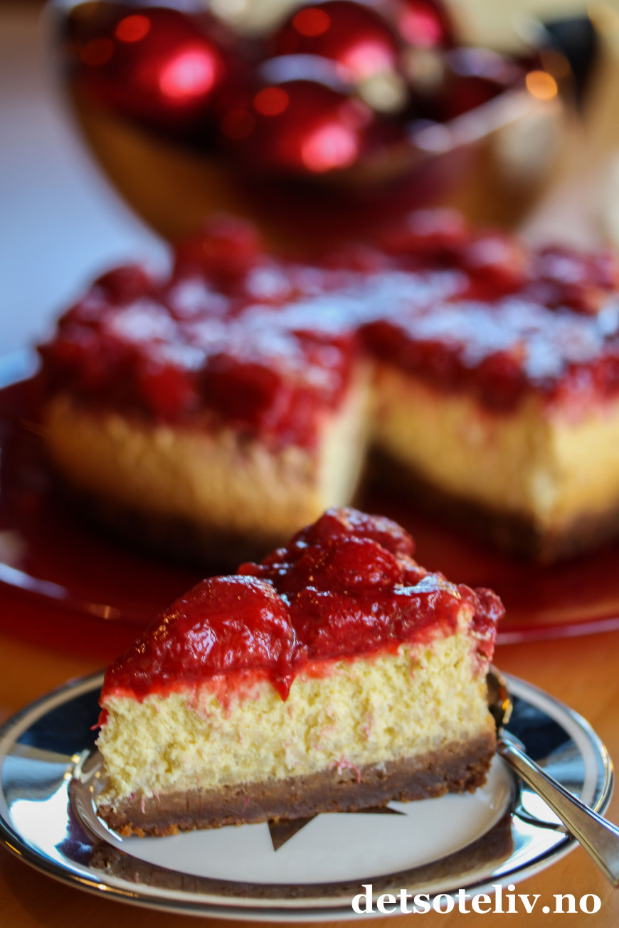 Det spesielle med denne ostekaken er særlig at risgrøt blandes i ostefyllet. Sammen med vaniljesmaken, får fyllet riskremaktig smak. Nydelig sammen med pepperkakebunnen og jordbærkompotten på toppen!