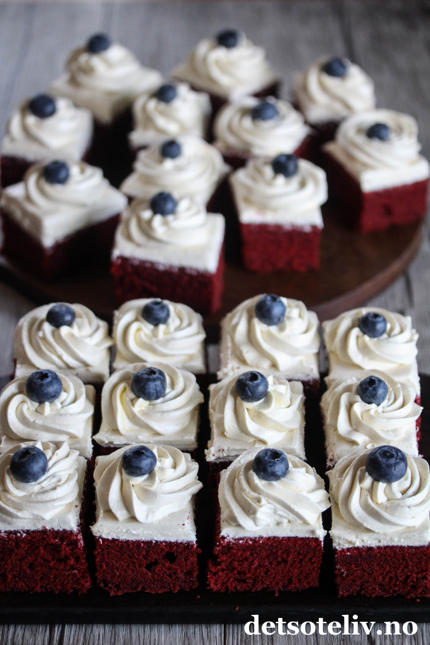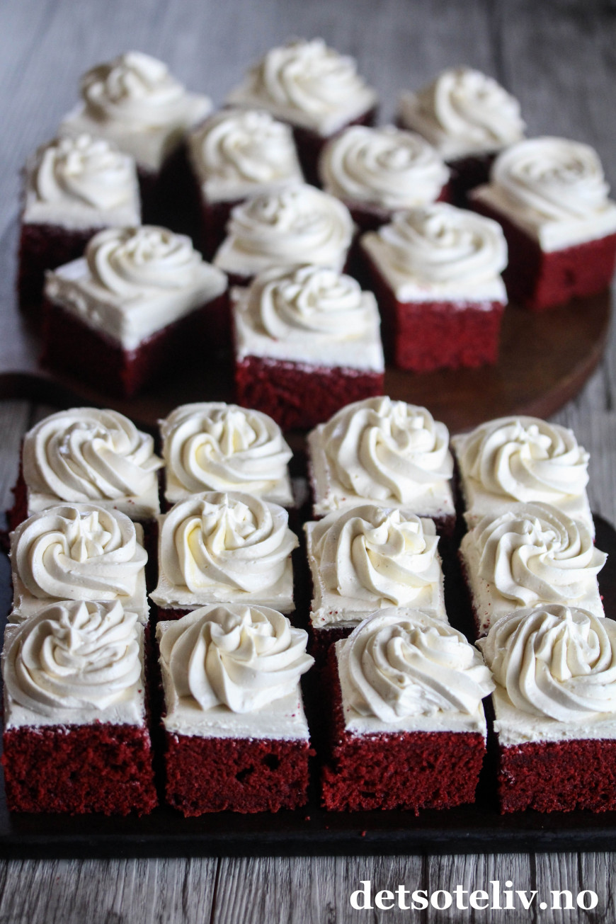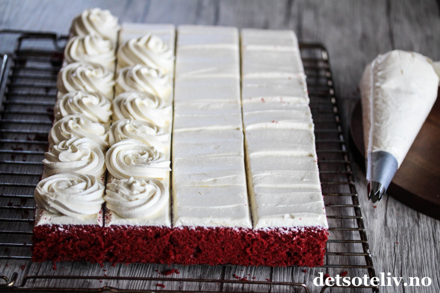 Her får du den amerikanske kakeklassikeren "Red Velvet Cake" som flott og praktisk langpannekake. Denne røde fløyelskaken er egentlig en sjokoladekake, som tilsettes konsentrert konditorfarge slik at fargen blir mørkerød.