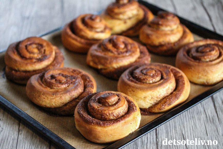 Legg kanelbollene på bakepapirdekkede stekeplater.