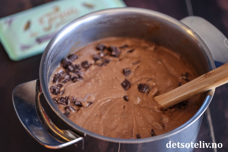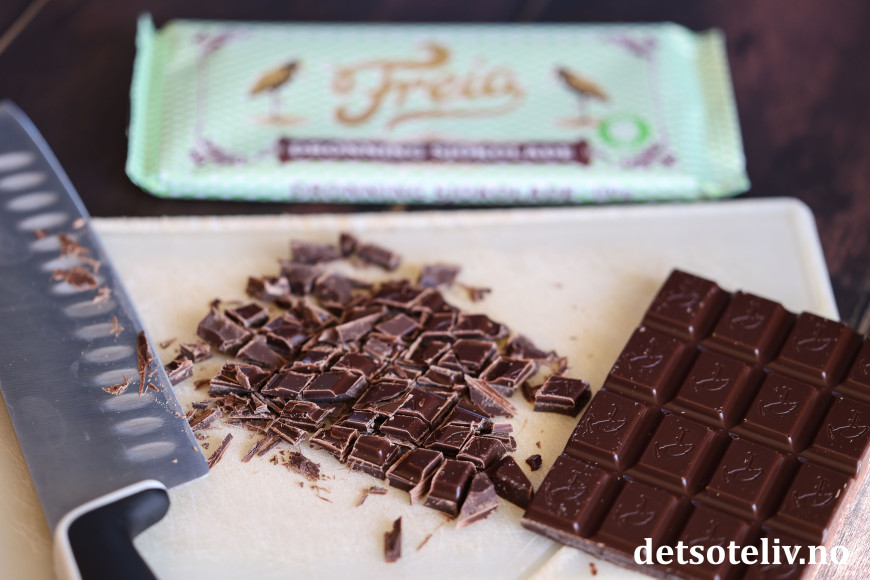Hakk Freia Dronningsjokolade opp i biter og vend sjokoladebitene inn i deigen.