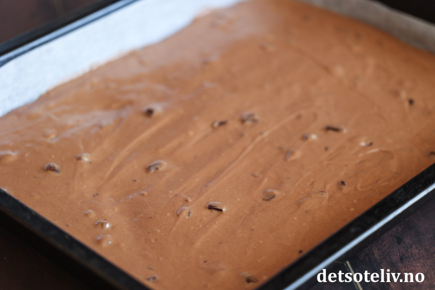 Ha den ene halvparten av deigen i en stor, bakepapirkledd langpanne (ca. 30 x 40 cm). Smør deigen jevnt utover i et tynt lag.