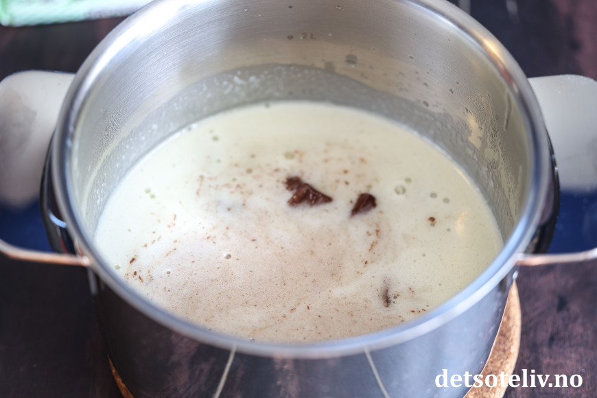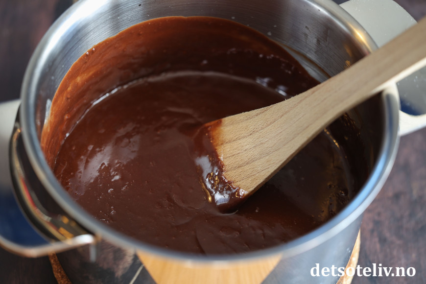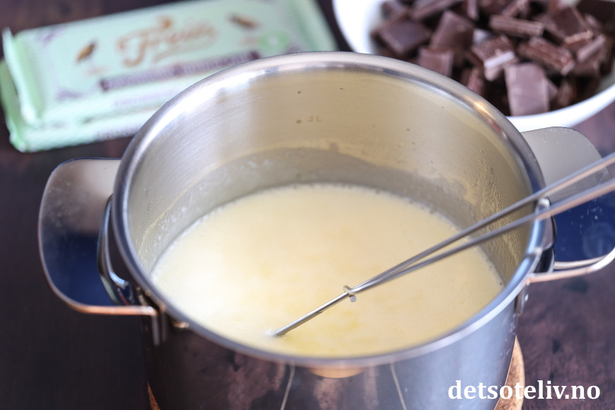 La sjokoladen ligge i kjelen og rør forsiktig rundt til sjokoladen har smeltet helt.