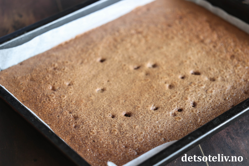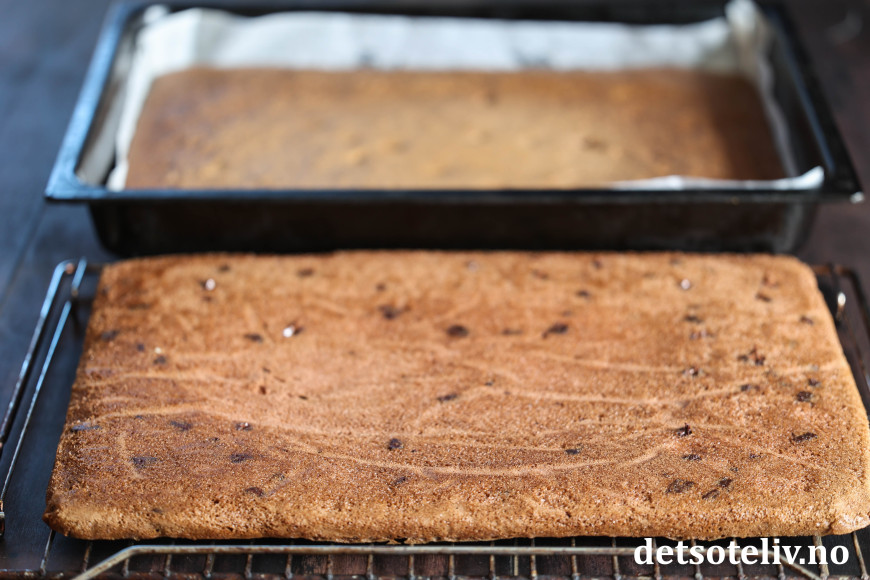Stek kaken midt i ovnen ved 180°C i ca. 10 – 12 minutter (sjekk med kakenål at kaken er gjennomstekt).