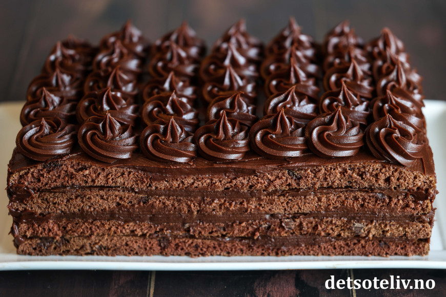 ♥ Det viktigste for å lykkes med denne kaken er å ha tålmodighet når det gjelder å la sjokoladekremen få tykne gradvis. Når den er varm og nylaget, vil den være helt tyntflytende, men etter å ha stått og avkjølt seg i flere timer (gjerne minst 5 – 6 timer), vil den tykne så mye at det går fint å sprøyte ut rosetter.