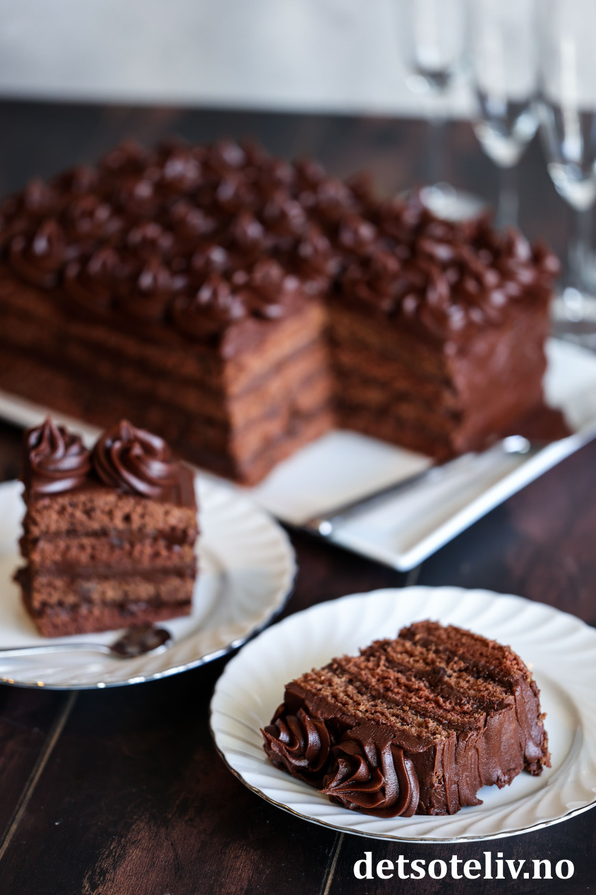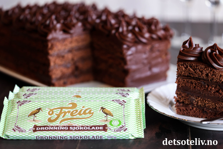 Denne kaken består av 4 myke, firkantede sjokoladekakebunner som settes sammen med en helt himmelsk god sjokoladekrem. Den gode sjokoladesmaken kommer av at jeg bruker Freia Dronningsjokolade, både som biter i sjokoladekakebunnene og i solide mengder i sjokoladekremen. Kremen blir tykk, «glossy» og fristende.