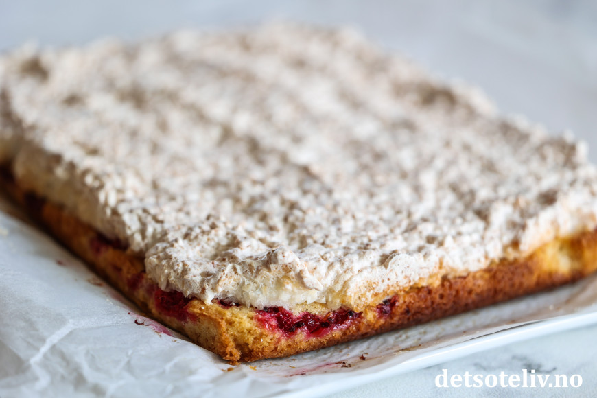 Når kaken har stekt i 25 minutter, tas den ut av ovnen. Bre kokosmarengsen over i et jevnt lag.