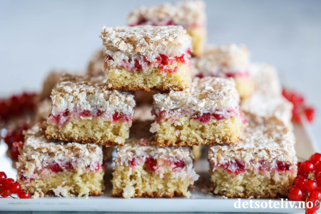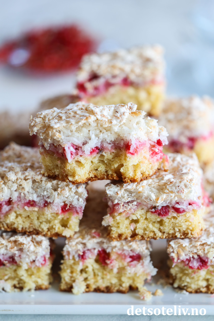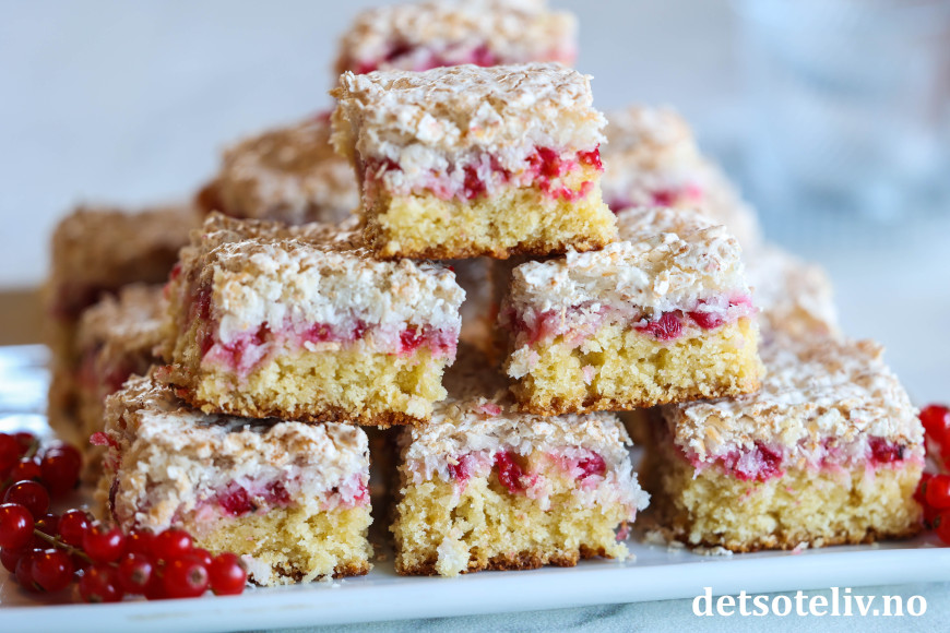 Det er herlig å bake med rips fordi smaken av de syrlige bærene da balanseres med søt kake. Dette gjelder ikke minst denne deilige kaken som dekkes med digg kokosmarengs! 😍
