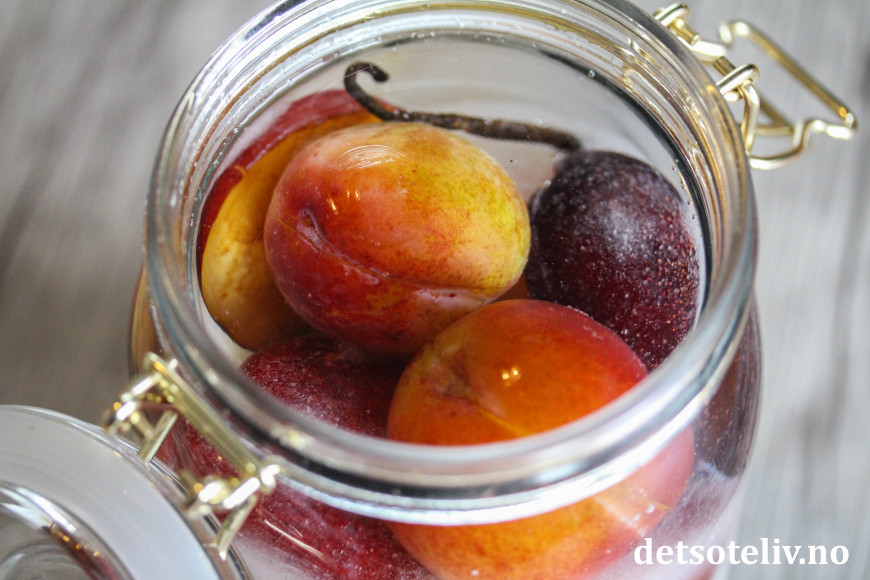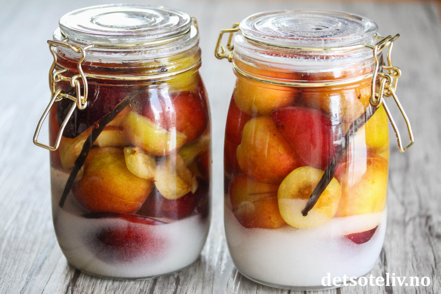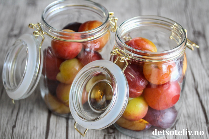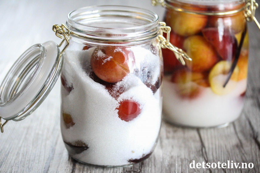 PS: På bildene ser dere at jeg fylte glassene helt opp med plommer fra starten, men det er lettere å fylle halve glasset om gangen som jeg beskriver i teksten.