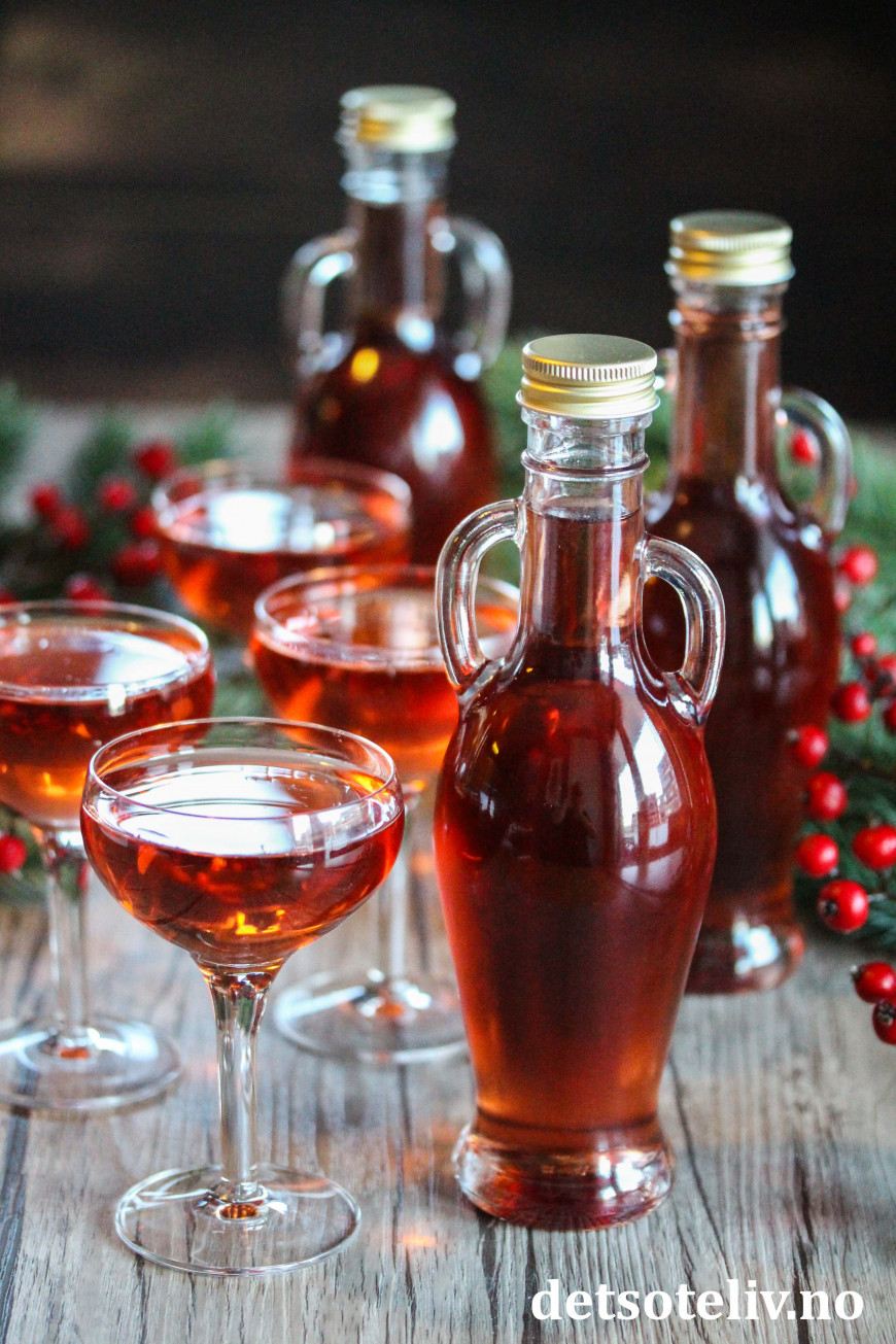 Jeg testet å lage dette i fjor høst, og her ser dere bilder fra prosessen. Etter noen måneders lagring var likøren ferdig, og resultatet ble kjempebra!