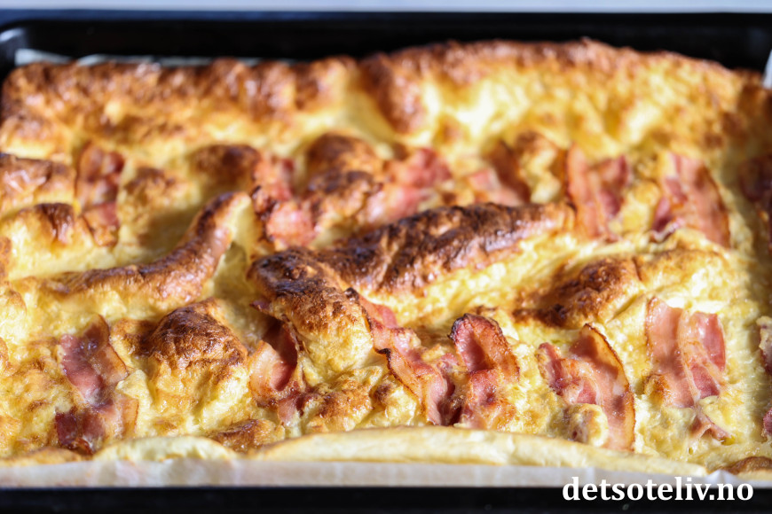 Her har jeg laget en amerikansk variant med bacon. Dette blir som varm Fleskepannekake stekt i langpanne! 😃