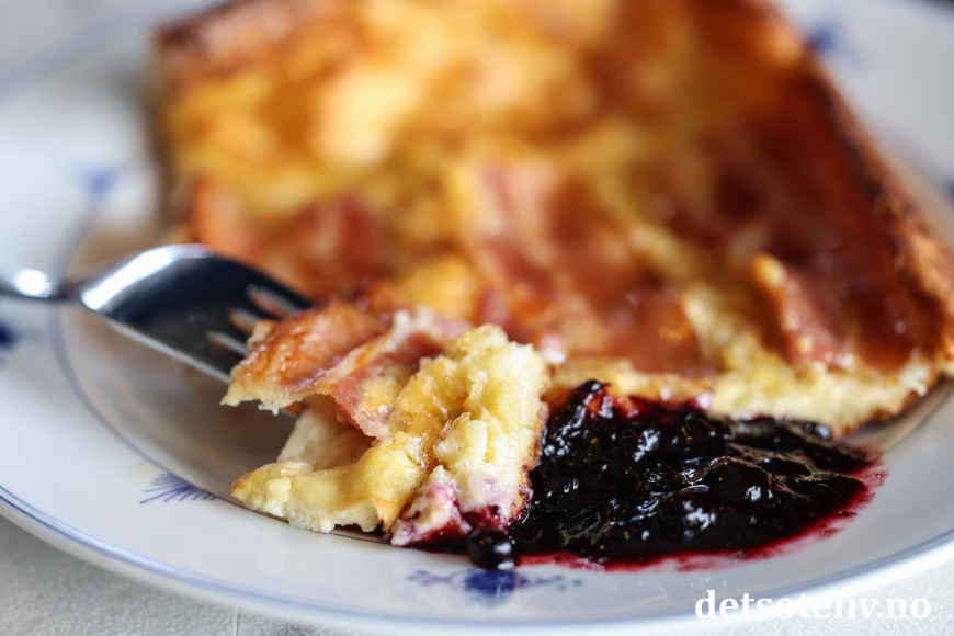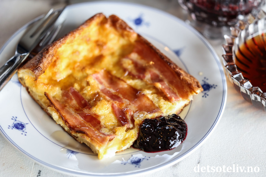 Ovnspannekaken deles i store biter som serveres varme med blåbærsyltetøy og lønnesirup.... oh la la... 😋