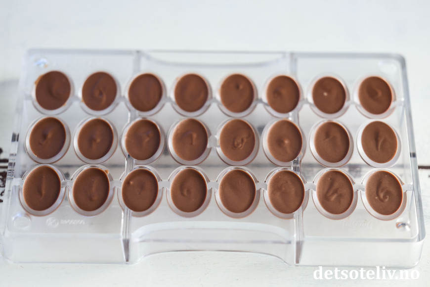 Sett i kjøleskapet til sjokoladen har stivnet (det tar noen timer, men sjokoladen kan gjerne stå i kjøleskapet over natten).