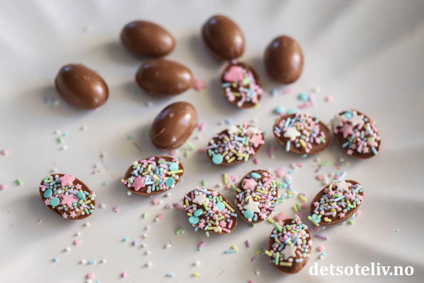 Sett halve påskeegg sammen to og to med litt smeltet melkesjokolade. Alternativt kan du bruke dem halve. Smør eventuelt på litt smeltet melkesjokolade og dryss på kakestrøssel til pynt.