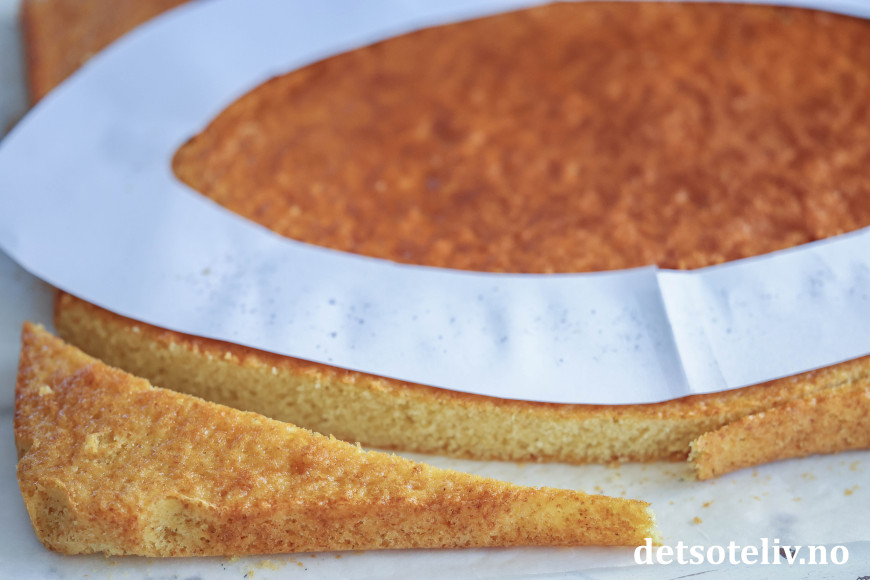 Gjenta med den andre kakebunnen. La kakebunnene avkjøles helt før du hvelver dem ut av langpannen og fjerner bakepapiret.