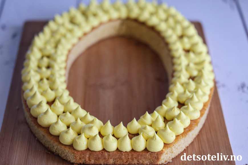 Sett den nederste kakebunnen på et fat. Ha den gule kremen i en sprøytepose med ønsket sprøytetipp (jeg bruker her Wilton Stor Rund Tipp #1A). Dekk hele kakebunnen med gule kremtopper.