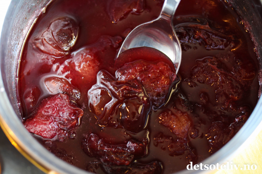 ♥ Som sagt bør du tilpasse vannmengden til etter hvor faste plommene er. Da jeg lagde det lysegule plommesyltetøyet brukte jeg bare halvparten av vannmengden og det tok ikke mange minuttene før de gule plommene løste seg opp. De røde plommene måtte jeg derimot koke en stund og da trengte jeg også alt vannet. Prøv deg frem - og det skader uansett ikke om du bruker full vannmengde.