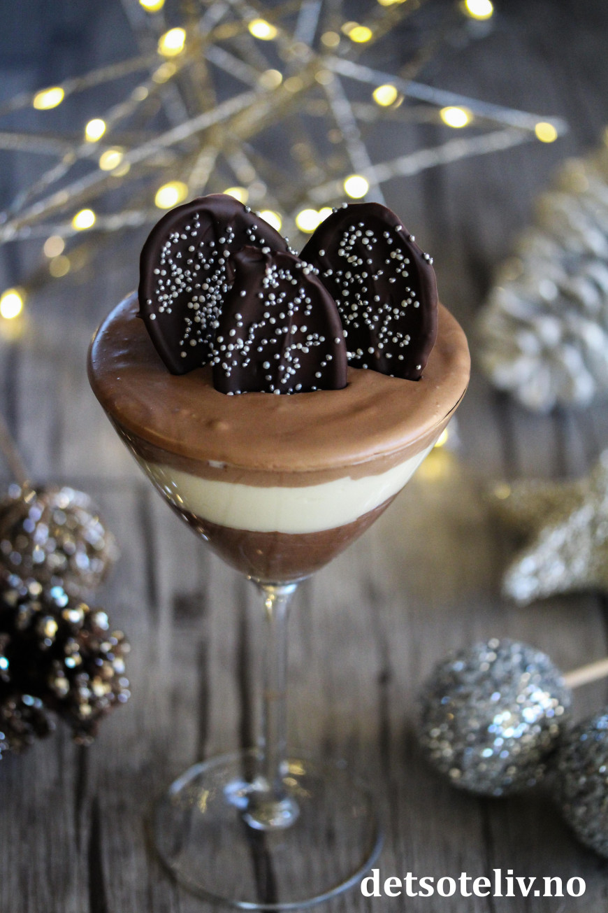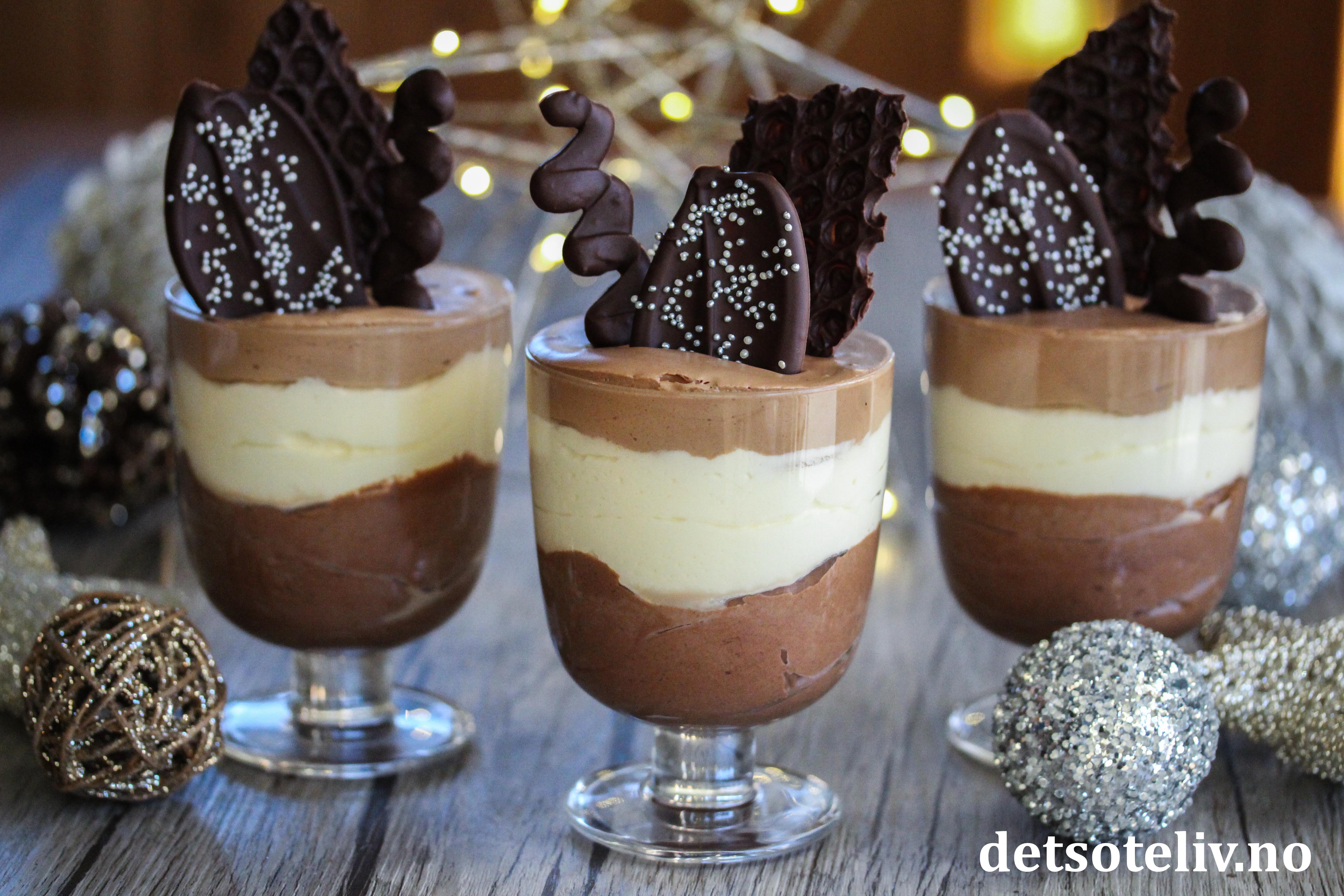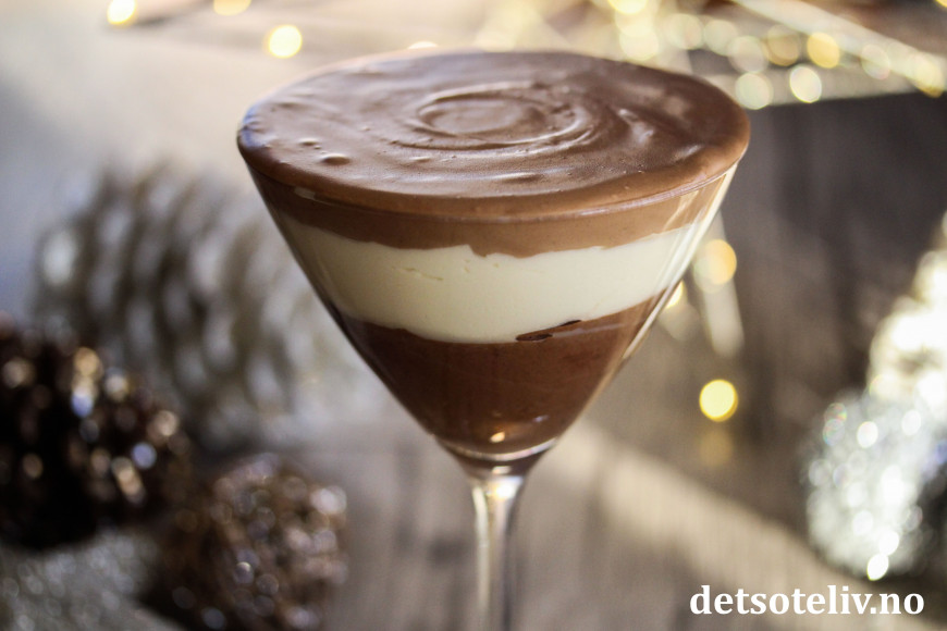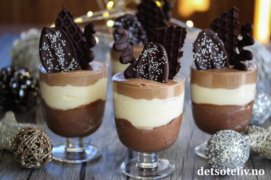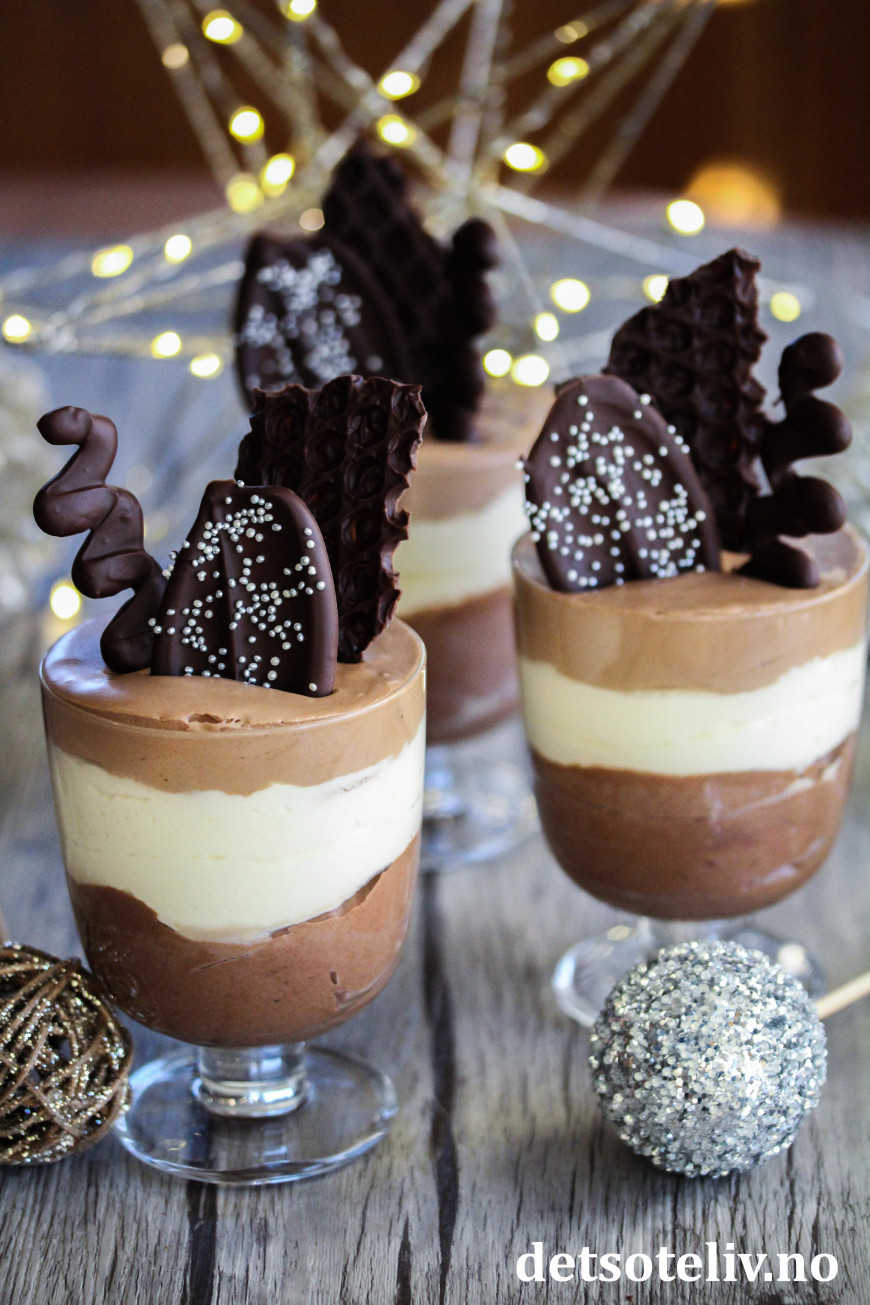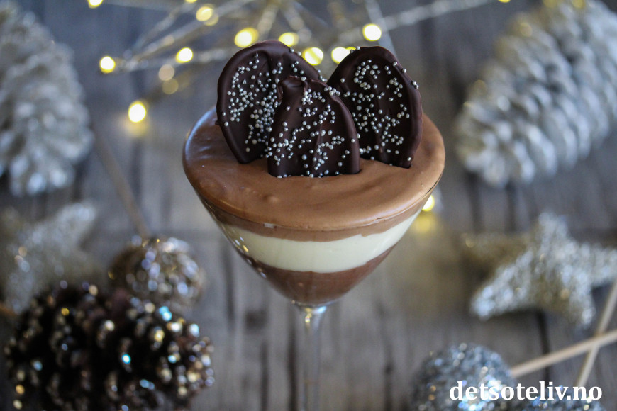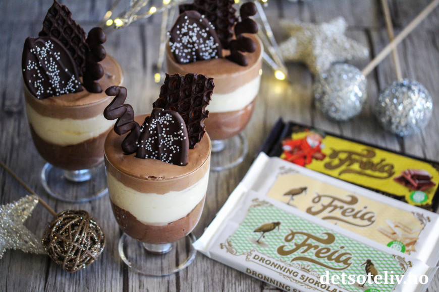 Her har jeg laget en ekstra feststemt dessert med tre lag sjokolademousse, der jeg bruker Freia Dronningsjokolade til det mørke laget, Freia hvit sjokolade til det midterste, hvite laget og Freia lys kokesjokolade til det øverste, lysebrune laget.