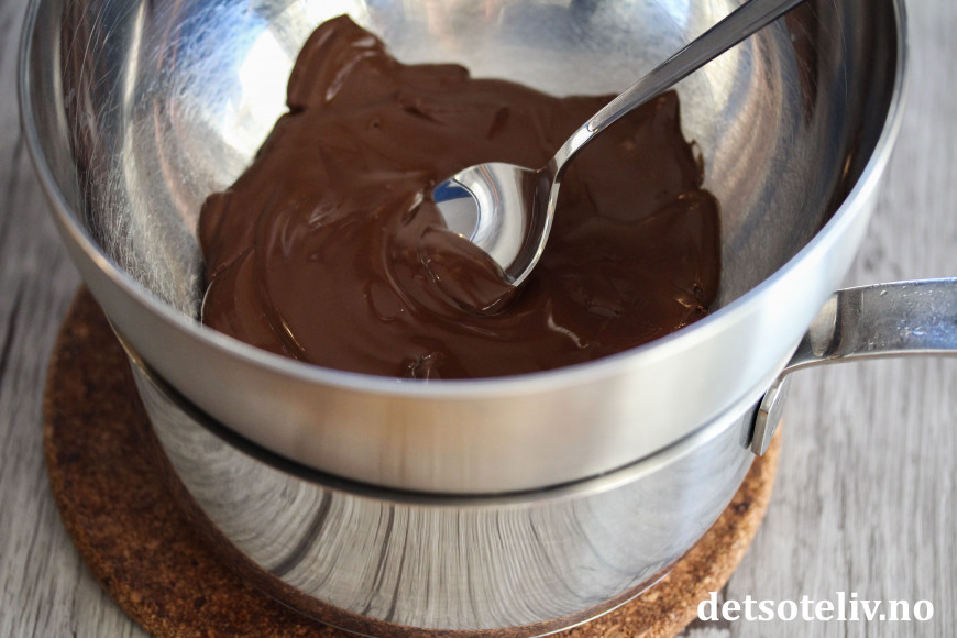 ♥ Du kan alternativt smelte sjokoladen i en skål i mikroen. Varm da sjokoladen i 1 minutt av gangen. Rør rundt mellom hver gang og slutt når sjokoladen har nesten smeltet. La da sjokoladen stå i noen minutter til den smelter helt.