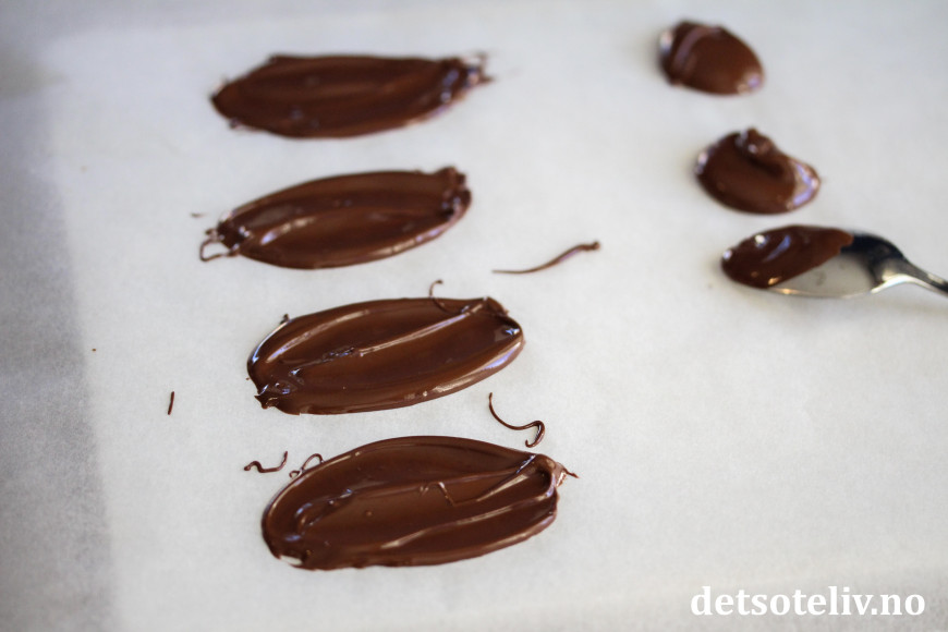 1) Legg bakepapir på en fjøl. Sett teskje-store klatter med smeltet sjokolade på bakepapiret og dra sjokoladen utover med baksiden av en skje.