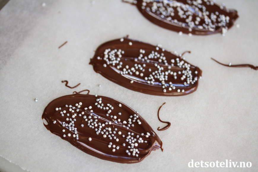 1) Legg bakepapir på en fjøl. Sett teskje-store klatter med smeltet sjokolade på bakepapiret og dra sjokoladen utover med baksiden av en skje. Dryss gjerne på kakestrøssel til pynt. Sett fjølen i kjøleskapet i minst 30 minutter, slik at sjokoladepynten stivner. Den vil da løsne lett fra bakepapiret.