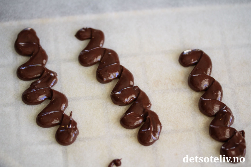 2) Den smeltede sjokoladen kan også has i en sprøytepose. Klipp hull i enden på posen og sprøyt ut ønskede formasjoner på bakepapiret.