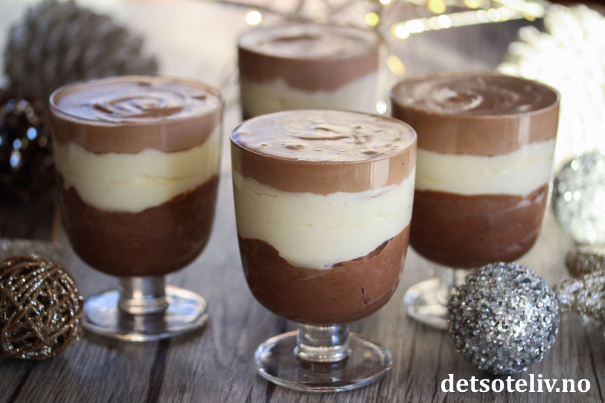 Fordel den lyse sjokolademoussen over den stivnede, hvite sjokolademoussen i dessertskålene. Sett skålene tilbake i kjøleskapet i et par timer, så også det øverste laget med sjokolademousse stivner helt.